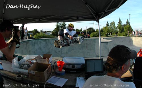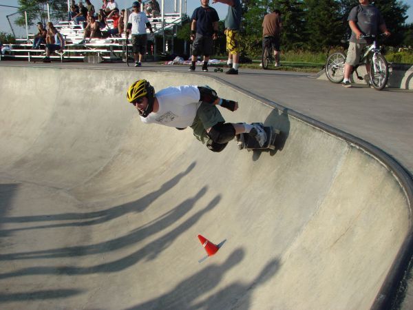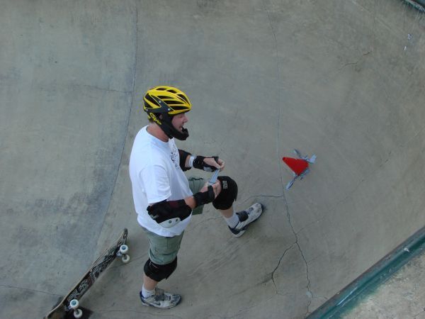 On the day of the race, Dave and I got there early and set it up, all the while debating where to place each cone. Pat Chewning was the instigator of this whole thing, and was setting up the sound and details with his computer. This was truly the Slalom Geeks meet the park riders. With the Sanction of the City of Aumsville, and the State of Games of Oregon, it was official.