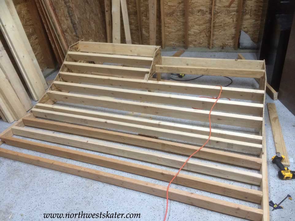 ![]() This first part of the ramp will be 8 feet wide, and divided into 4 sections. Each section will be different heights. The lowest will be 12 inches high, and increasing 6 inches for each section. This photo is of the two lower sections. So far all this wood has been used before, both as a (June's) ramp and a storage unit loft. |