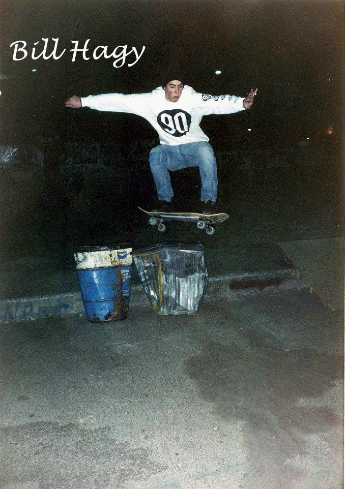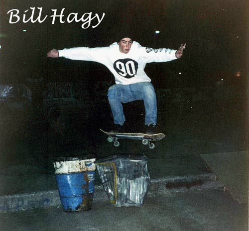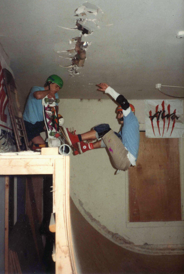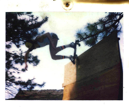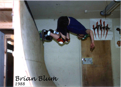 Here's Brian riding his ramp with no pads (well, he does have his safety hat on), doing a wheeler on a G & S Warp Tail 2. (Click photo for larger image).