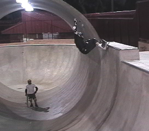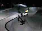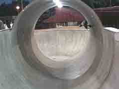 At about 5 PM we drove up to Baldy, the Persuader was complaining. Sputtering from the heat, I suppose. We arrived, and Mrs. Baldy was giving us the eye. She lives right next to the entrance, and she hates skaters. She was just waiting for us to jump the fence so she could call the rangers. So, we got spooked, and left for the night session at Upland. We cooked dinner (Ravioli) and hit the pipe. This time the lights came on, and so did a couple of local rippers. This was a fun session at Upland. However, we didn't see Salba, they said he usually comes out on Friday night. We skated right up to closing time, 10 PM. This was the best night skating we had experienced ever. Epic was the word that kept coming to mind. Had the trip ended here, it would have been worth it. Upland, all by itself was worth the trip. It's so fun, the deep end is 11 feet deep with perfect concrete. The Pipe, 20 feet in diameter, it just doesn't get much better. Now normally on a skate trip, a guy has to pace himself (especially when you're as old as me), because there's always more stuff to skate the next day. But, Steve kept skating hard, and I couldn't stop either. We both skated so hard, we were just beat. Dead tired. .
