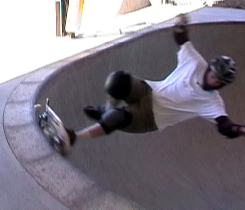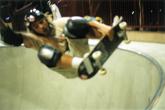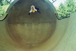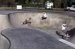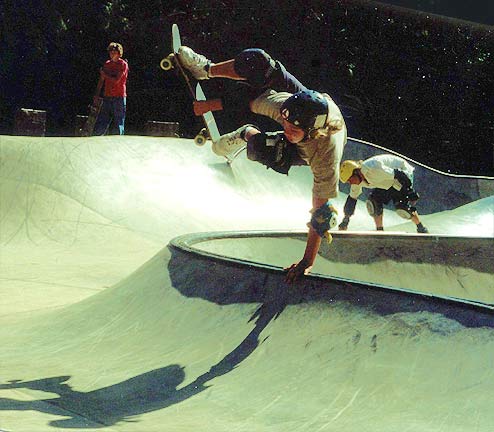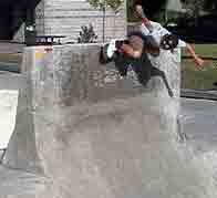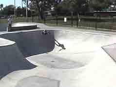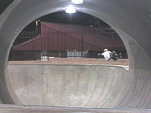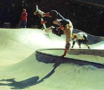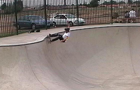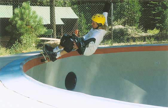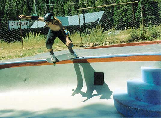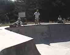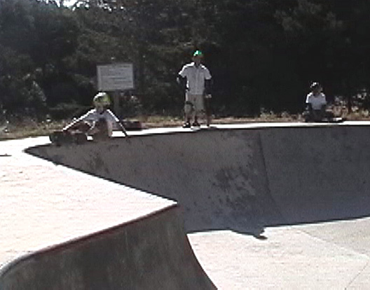 Basically, we could have put our helmets on and skated, because the sun had come up. However, we went to McDonalds to wake up and get some food. We came back to the park, and skated for an hour or so. During that time, another cop pulled up and told a local kid to either leave or pay a fine (250 bucks) for not wearing a helmet (Dang, these Grants Pass cops are a little uptight!). The park was OK. We had fun skating here. We were doing slides on the banks, and skating fast in the deep end. We even did a couple of trains, following Max. It's a lot like Seaskate, only a little deeper, and a lot bigger.