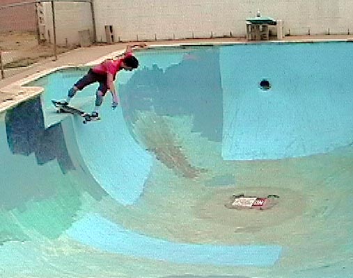 After Fontana, we followed John to this gnarly square pool. It was getting hot, but we didn't care, we just drank more water, and hosed ourselves off more. This pool was in Fontana, at an abandoned house. John called it the blue patch bowl, because of the patchwork of paint in the pool. The bowl was one of the tightest trannies I've ever tried to skate. The best we could do was get a grind on the love seat. It was difficult, but that just made it that much more fun. We skated hard for about an hour, and called it good. We thanked John, and headed for LA.