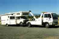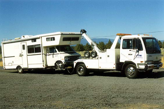 Before we left on the trip, I did two things. One was spend a bunch of money to get the Persuader fixed up, to try and prevent a break down. And two, I signed up for the RV sized AAA, just incase. And so, I was on the (new) cell phone at 8 AM (and felt lucky to get a signal) with AAA, we were about 40 miles south of Klamath Falls, on hwy 139, in California. The California AAA lady didn't know where we were exactly so she forwarded my call to the Oregon folks. Who knew, and told me it would be about an hour. Then they called me back. They asked, "How many people do you have with you again?" Seven I said. Hmm...Two trucks were sent out. One truck took Steve and four kids directly to the Skatepark. And another truck took Jeremy and I and the Persuader to the repair shop.