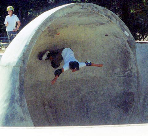 We woke up and hit the road, headed for Upland. Arrived around 11 AM. Steve and all the crew were stoked. They couldn't believe their eyes. A huge pipe, built for just skateboarding. We all skated, and learned the terrain. We noticed the stickers in the pipe and some were really high, and wondered how high we could get. So, we stuck some of our own stickers, and we surprised ourselves by sticking some pretty high, around 10:30 in the pipe. Pretty respectable for out-of-towners like ourselves. So we were satisfied that we'd accomplished something. We all skated until we just couldn't take the heat anymore. It was 104 degrees, at around 1 PM. We had the roof top air conditioning in the Persuader, and that was a lifesaver, we all stood under the cool air and decided to head out to the nearest mall and hang there to get cooled off. .