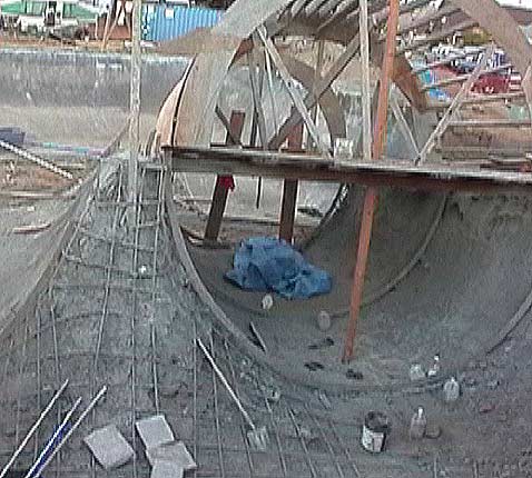 We skated until 4:30 PM had lunch, and pressed on to Port Orford. Now, along the way is Reedsport, Oregon. Airspeed is building a park there, as I write this (I think he said October '03 it will be finished). So, we stopped in to check it out. One of the main features is what they are calling a "Funnel Tunnel", which is basically a full pipe that is large on one end, and smaller on the other. Geth Noble, the owner of Airspeed, just happened to be working late Sunday night, getting ready for a pour on Monday morning. We talked with him for a few minutes, and he explained how the concrete "imprinting" was done at Waldport and Reedsport. Reedsport will have a pool replica with "imprinted" tile and a death box. This appears to be another skatepark that I will have to get back to and skate!