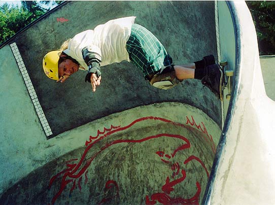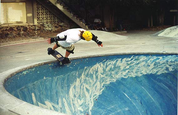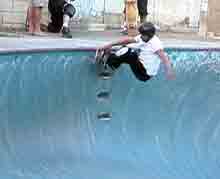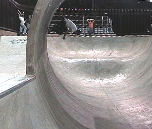 The Combi bowl replica is a little smaller than the original, but it was supper fun. It has about 8 inches of one-inch ceramic tile at the top, just like a real pool. And what I noticed is that not only was it fun to ride, but it was also an indicator of speed. The combi bowl is a square bowl, and a round bowl, that is connected together (hence the name). Two perfectly shaped bowls. And when you hit the square corners with speed (actually they are rounded courners), the wheels running over the tiles makes a sound at different frequencies, such that you can hear the differences in speed (dud, dud, dud, DaDaDaDaD ). Very cool! Steve and Max were figuring out the lines. Getting airs, and long grinds. I was trying to get a couple of carve grinds in both bowls. We met a couple of cool locals. One guy (Matt?) said that he recognized us from Sleestak.net and one time while I was riding he said, "Do a one footer!" Which, I was more than happy to try. I was able to get a couple, before slipping out and almost falling. I was so tired. I skated myself out (again), it was just too much fun. I could have stayed here for the whole week and been happy, that combi bowl is nearly perfect. Just another page in our epic journey.
