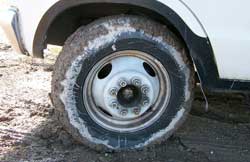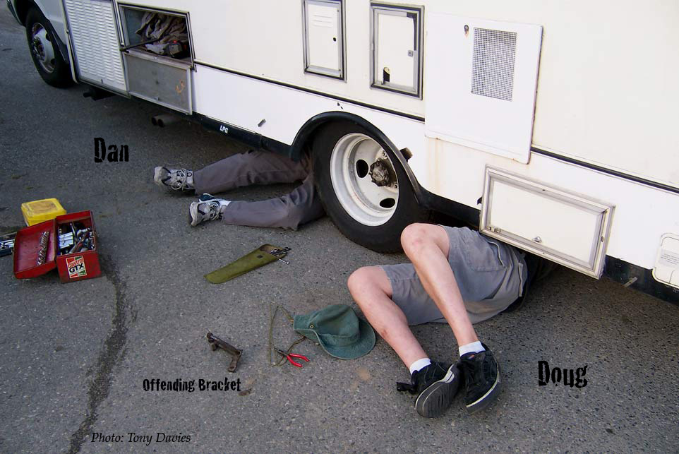 | So, once again, going up the pass the Persuader breaks down (I was hoping this wouldn't be an indicator of the rest of our trip). We pulled the bracket off, and limped our way to the small town of Cle Elum just about a mile or so away. We were lucky to find a gas station that allowed us to use their tools, and vice to rig up a coat-hanger that would hold the floppy helper leaf spring off the tire. Two things that shouldn't hang together, floppy helper leaf springs, and tires. |