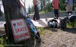 In the course of two hours, it doesn't take long for skateboarders to get into trouble. While Doug and I worked on the fix, Jesse and other riders were chatting up some young ladies from Canada, who were also stranded. They were on their way to some concert (something called a Sasquatch Festival at the Gorge or something?) when their brake calipers pretty much came off. I'd have to agree that's not a good thing either.
