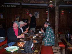So after looking for a few minutes, we found the Moose Saloon in Kalispell. And they were right, this was quite a place. As we walked in, I noticed that there was sawdust all over the floor? I guess that's supposed to give one a feeling of being in a barn (I know it did for me). Add to that is the fact that every thing (benches/walls/tables/everything) is made of wood, and has been carved up by someone's pocketknife. The "Persuader was here"... ha ha ha...