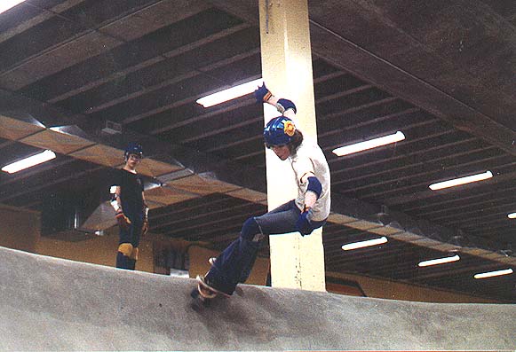 Tim and I visited the Burnaby skatepark a couple of times, it was housed under a ice rink, and one problem was the roof was so cold that it would condensate and drip, but they fixed that problem after a while. One time my dad brought us and a few members of our Jr. High School Skateboard club at the time. This is a picture of me in one of the bigger bowls. Notice no coping. I never had the lipslides wired, but it was pretty easy to do here.