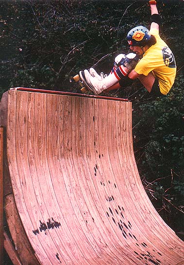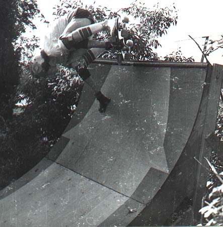 I decided that my quarter pipe needed more vert. So, I added it. And covered it with paneling. Which lasted longer than Masonite. Interesting, this trick is now called a lean air, I called it an underhand air. At the time, I sent Skateboarder Mag. a whole sequencial shot of me doing a frontside lean air. I had hopes that they might publish maybe one of the photos. But, to no avail. However, I did start to see pictures in the mag of pros doing lean airs well after I had sent my photos in.