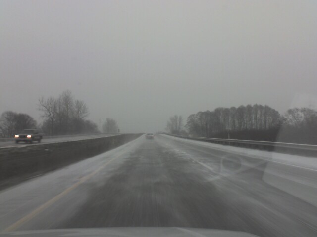 The snow actually came in pretty fast, and it was already cold, so that made for very slippery conditions. On our way down the freeway we saw 3 cars spun out in the ditch. Later John who was trailing us by a few minutes said he counted 5 cars in the ditch.